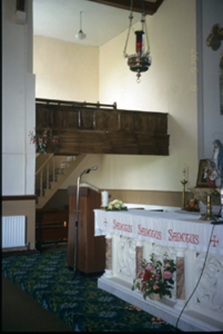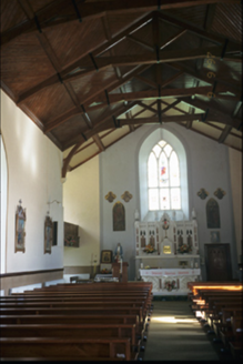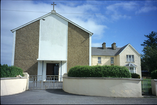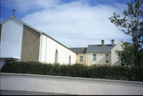 Freestanding T-plan gable-fronted double-height Roman Catholic church, built c. 1865, with three-bay side elevations and single-bay transepts. Pitched artificial slate roof with cross finials. Concrete canopy over entrance. Pebbledashed walls with render central panel to entrance gable. Rendered walls to sides and rear. Lancet openings with cut-stone block-and-start architraves, timber Y-tracery and coloured glass. Timber matchboard double leaf doors. Retaining interior features including marble altar, cusped sacristy door, gallery in transept and exposed roof timbers. Attached L-plan three-bay two-storey parochial house, dated 1872, to right having gabled projecting end bay. Rendered boundary walls. Steel belfry to site.