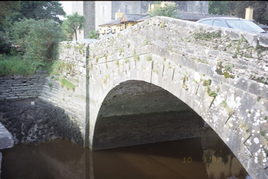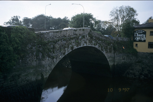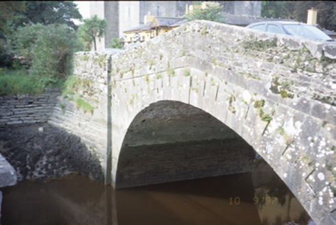 Single-arch rubble stone hump-back road bridge over Owengarney river, dated 1804, with cut-stone voussoirs, copings and inscribed plaque. Plaque inscribed ‘Bunratty Bridge built by Tho Stuadert Squire at his own expense and finished A.D. 1804 John Smyth Arch. John Crowe Mason.’
