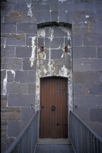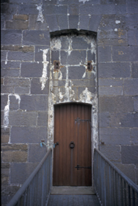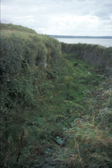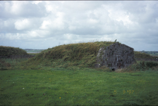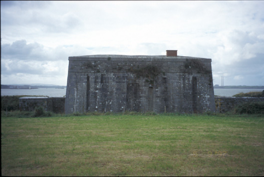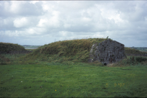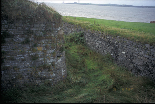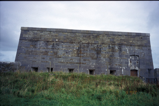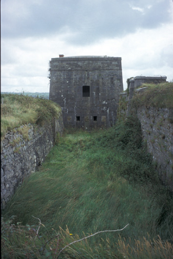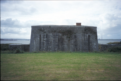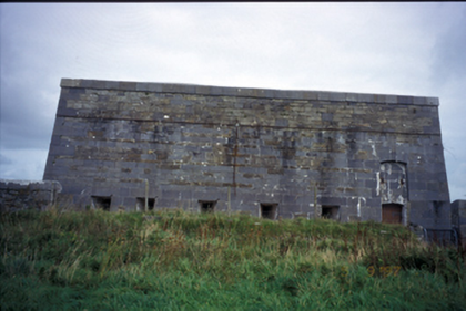 Freestanding six-bay single-storey over basement fort, built c. 1810, surrounded by moat. Now disused. Inclined cut-limestone parapet with brick chimneystack to roof. Cut-limestone walls with base batter. Timber matchboard door set in segmental-arched recess to accommodate retractable drawbridge. Gun loops and square-headed windows with cut-stone dressings. Detached four-bay single-storey magazine with moat and base batter to site. Snecked stone retaining walls to glacis extending to shore. Cut-stone gate piers set in rubble stone walls.