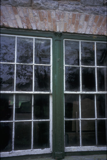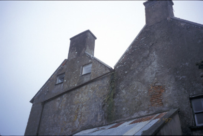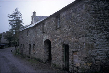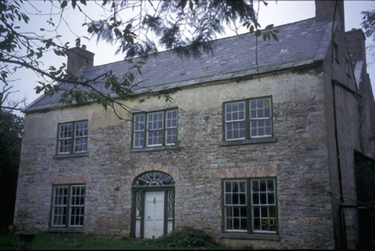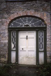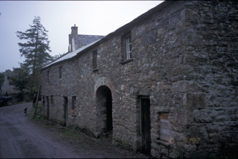 Detached double-pile three-bay two-storey farmhouse with dormer attic, built c. 1800, possibly incorporating fabric of earlier building, c. 1680. Pitched slate roofs with roughcast rendered chimneystacks and cut-stone gable copings. Remains of roughcast and lime render to rubble stone walls. Paired and tripartite timber sliding sash windows with fluted engaged columns having decorative capitals forming mullions. Segmental-arched opening with timber pilaster doorcase, fanlight, sidelights and timber panelled door. Timber panelled interior shutters. Detached four-bay single-storey outbuilding with integral carriageway. Cut-stone and cast-iron piers with wrought-iron gates.