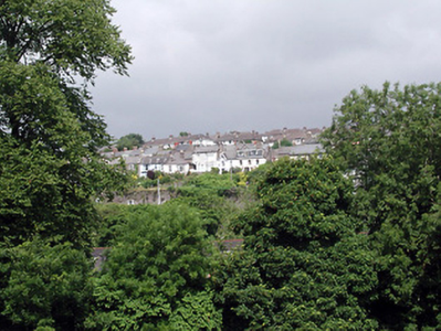 End-of-terrace three-bay two-storey house, built c. 1855, with projecting central bay to south elevation. Pitched slate roof with rendered chimneystacks and flat-roofed dormer addition. Rendered walls. Replacement uPVC casement windows. Roughly dressed sandstone boundary walls with segmental-arched door opening having timber matchboard door.