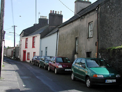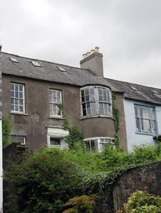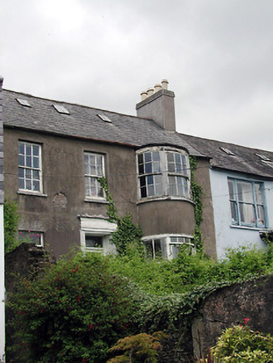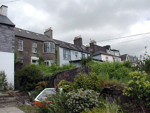 Terraced split-level three-bay two-storey house, built c. 1835, with two-storey projecting bow addition. Pitched slate roof having rendered chimneystacks and cast-iron rooflights. Rendered walls. Timber sliding sash window. Remains of timber door surround with timber panelled door. Roughly dressed sandstone boundary walls with segmental-arched door opening having timber matchboard door.