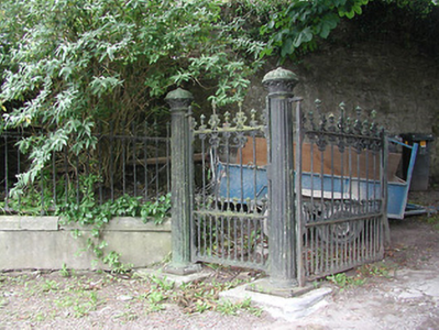Pair of cast-iron gates with cast-iron piers and railings, c. 1835, set in roughly dressed stone wall having ashlar limestone copings. Stone cobbles leading from road to entrance.