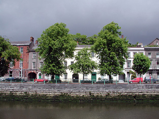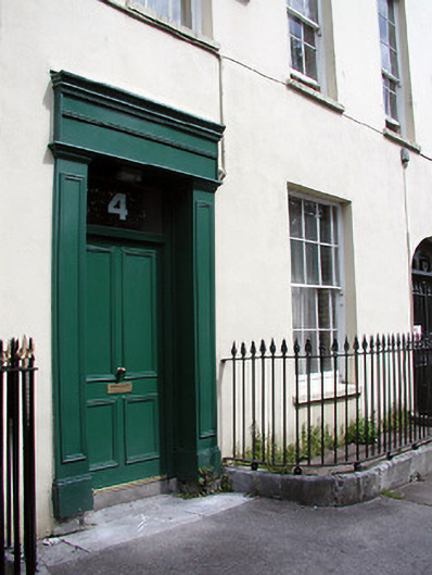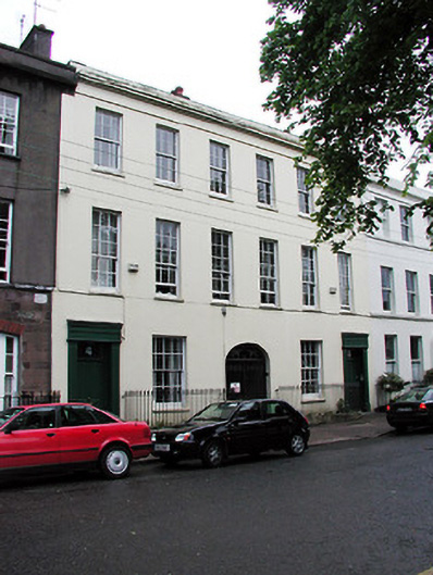 Terraced double-pile three-bay three-storey former house with integral carriage arch, built c. 1810, as a pair with the adjoining former house to the east. Now in use as flats. Pitched slate roof having rendered parapet, moulded cornice and rendered chimneystacks. Rendered walls. Timber doorcase with timber panelled door and toplight. Timber sliding sash windows. Replacement cast-iron railings set on limestone plinths to site. Replacement pair of cast-iron gates to carriage arch.