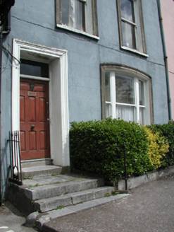 Terraced double-pile two-bay three-storey house, built c. 1815, as a pair with the adjoining house to the east. Pitched slate roof with rendered parapet, moulded cornice and rendered chimneystacks. Rendered walls having moulded render surrounds to windows, added c. 1860. Segmental-arched window opening to ground floor with tripartite timber sliding sash window. Timber sliding sash windows to upper floors. Square-headed door openings having moulded render door surround, timber panelled door and toplight. Retaining interior features. Flight of limestone steps leading to front door. Cast-iron railings set on limestone plinths to site.