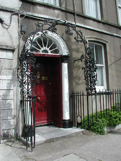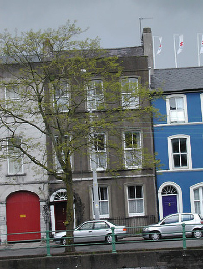 Terraced double-pile three-bay three-storey house, built c. 1820. Pitched slate roof with rendered chimneystacks and rendered parapet. Rendered walls having ashlar limestone string course between ground and first floors. Moulded render surrounds to openings and platbands at sill levels, added c. 1860. Segmental-arched window openings having timber sliding sash windows. Round-headed door opening, with engaged Ionic columns flanking recessed timber panelled door, having decorative fanlight and archivolt above. Cast-iron railings set on limestone plinths to site. Decorative wrought-iron arch with lamp bracket to front door. Retaining interior fittings.