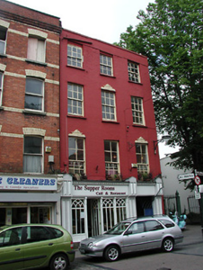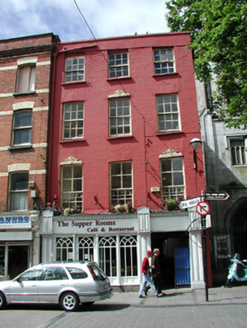 End-of-terrace three-bay four-storey former house with integral laneway, built c. 1800, now in use as restaurant and flats. Hipped slate roof having rendered parapet and rendered chimneystack. Brick walls. Timber sliding sash windows to upper floors with moulded render detail to some windows. Shopfront, c. 1999.