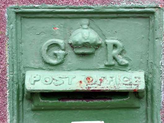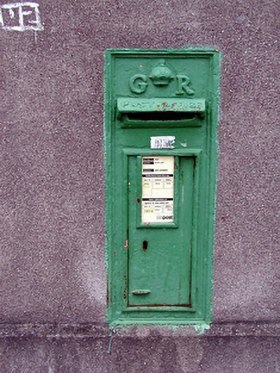 Wall-mounted cast-iron post box, c. 1915, with GR monogram.