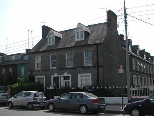 Semi-detached two-bay two-storey house, built 1898; having annexe to rear. Steeply pitched roof with red brick chimney stack having oversailing courses. Gabled dormer window with decorative barge boards to front elevation. Plain render finish with plain string course to first floor cill level. Square headed openings having single pane timber sliding sash windows with overlight to door opening. Moulded architraves to ground floor openings. Garden area to front bounded by low rendered wall with wrought iron gate and railings. Small walled garden to rear.