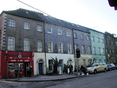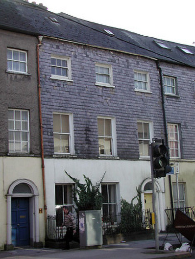 Terraced three-bay three-storey house, built c.1780; with annex to rear; one of five. Pitched roof with rooflights and rendered chimney stack. Slate hung upper floors with painted render finish to ground floor. Square headed window openings with cills. Windows are three over three pane timber sliding sash to second floor, replacement two over two pane timber sliding sash to first and ground floors. Round headed door opening with early timber panelled door, engaged Doric timber columns and plain fanlight. Small railed garden area to front having low carved limestone kerb with wrought iron railings.