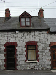 Terraced two-bay single-storey house with dormer attic, built c. 1902, as a group of twenty with the adjoining houses to the north-east and south-west. Pitched slate roof having red brick chimneystacks and gabled dormer window with carved timber bargeboards. Snecked limestone walls having red brick eaves course and dressings to segmental-arched openings. Replacement windows and door.