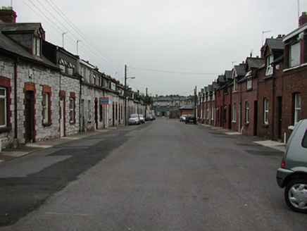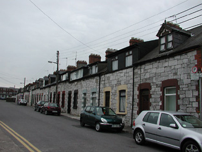 Terraced two-bay single-storey house with dormer attic, built c. 1902, as a group of twenty with the adjoining houses to the north-east and south-west. Pitched tile roof having red brick chimneystacks and rebuilt flat-roofed dormer. Snecked limestone walls having red brick eaves course and dressings to segmental-arched openings. Timber sliding sash window, replacement window and replacement door.