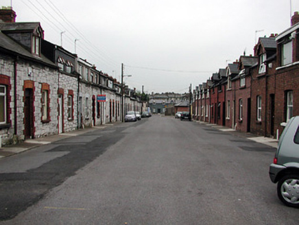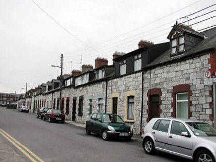 Terraced two-bay single-storey house with dormer attic, built c. 1902, as a group of twenty with the adjoining houses to the north-east and south-west. Pitched slate roof having red brick chimneystacks and rebuilt flat-roofed dormer. Snecked limestone walls having red brick eaves course and dressings to segmental-arched openings. Replacement windows and door.