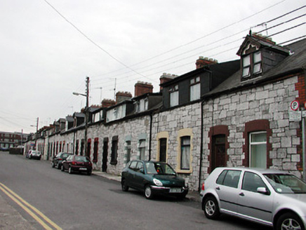 Terraced two-bay single-storey house with dormer attic, built c. 1902, as a group of twenty with the adjoining houses to the north-east and south-west. Pitched slate roof having red brick chimneystacks and gabled dormer window with carved timber bargeboards. Snecked limestone walls having red brick eaves course and dressings to segmental-arched openings. Timber casement windows to dormer and replacement window and door to ground floor.