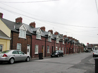 Terraced two-bay single-storey house with dormer attic, built c. 1903, as a group of thirteen with the adjoining houses to the south-west and north-east. Pitched slate roof with red brick chimneystack and gabled dormer window having carved timber bargeboards. Red brick walls with segmental-arched openings to ground floor. Timber sliding sash windows, timber casement windows and replacement door.
