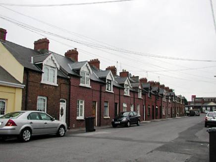 Terraced two-bay single-storey house with dormer attic, built c. 1903, as a group of thirteen with the adjoining houses to the south-west and north-east. Pitched tile roof with red brick chimneystack and gabled dormer window having carved timber bargeboards. Red brick walls with segmental-arched openings to ground floor. Replacement windows and door.