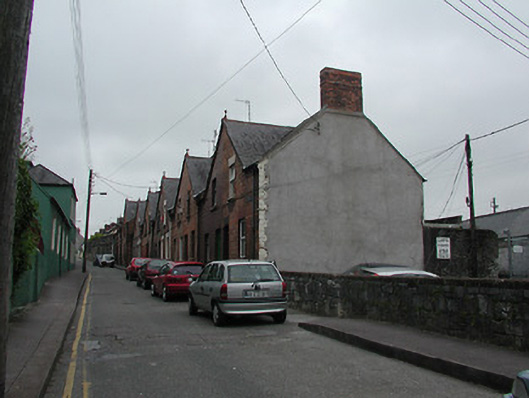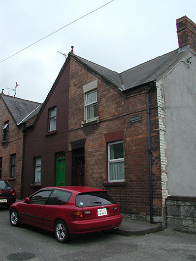 Terraced two-bay two-storey house, built c. 1899, having shared gable-fronted bay with the adjoining house to the west. Constructed as a group of ten with the adjoining houses to the east and west. Pitched slate roof having red brick chimneystack and terracotta finial. Red brick walls with limestone sills to window openings and having limestone threshold to front door. Replacement windows and door.