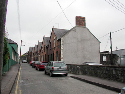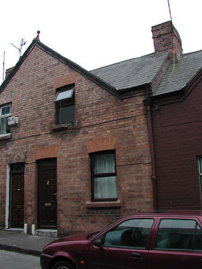 Terraced two-bay two-storey house, built c. 1899, having shared gable-fronted bay with the adjoining house to the east. Constructed as a group of ten with the adjoining houses to the east and west. Pitched slate roof having red brick chimneystack and terracotta finial. Red brick walls with limestone sills to window openings and having limestone threshold to front door. Replacement windows and door.