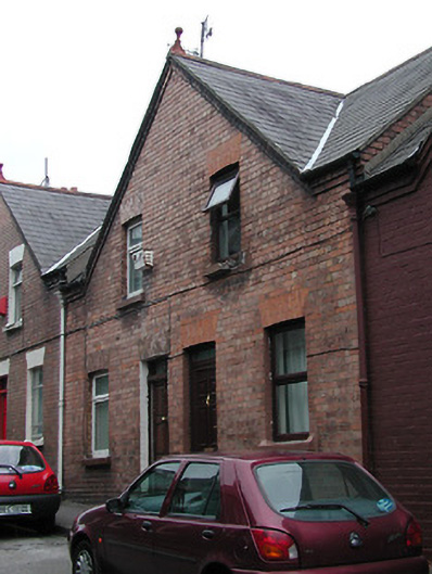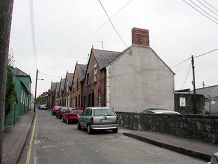 Terraced two-bay two-storey house, built c. 1899, having shared gable-fronted bay with the adjoining house to the west. Constructed as a group of ten with the adjoining houses to the east and west. Pitched slate roof having red brick chimneystack and terracotta finial. Red brick walls with limestone sills to window openings and having limestone threshold to front door. Replacement windows and door.