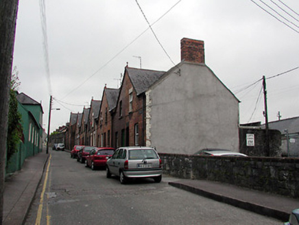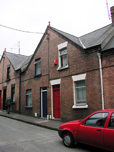 Terraced two-bay two-storey house, built c. 1899, having shared gable-fronted bay with the adjoining house to the east. Constructed as a group of ten with the adjoining houses to the east and west. Pitched slate roof having red brick chimneystack and terracotta finial. Red brick walls with limestone sills to window openings and having limestone threshold to front door. Replacement windows and door.