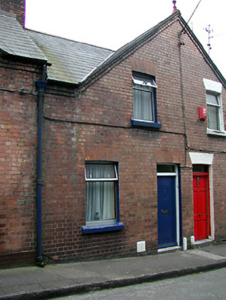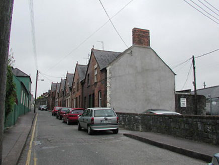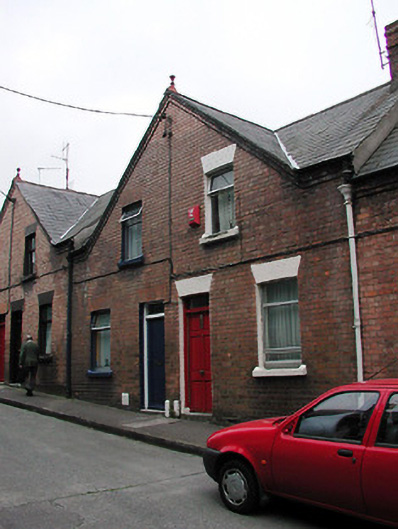 Terraced two-bay two-storey house, built c. 1899, having shared gable-fronted bay with the adjoining house to the west. Constructed as a group of ten with the adjoining houses to the east and west. Pitched slate roof having red brick chimneystack and terracotta finial. Red brick walls with limestone sills to window openings and having limestone threshold to front door. Replacement windows and door.