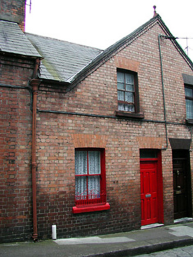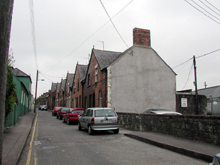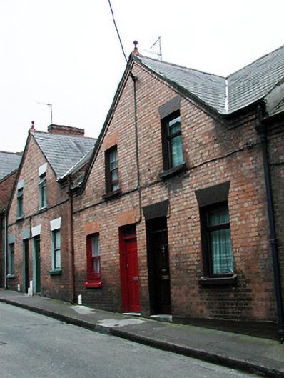 Terraced two-bay two-storey house, built c. 1899, having shared gable-fronted bay with the adjoining house to the west. Constructed as a group of ten with the adjoining houses to the east and west. Pitched slate roof having red brick chimneystack and terracotta finial. Red brick walls with limestone sills to window openings and having limestone threshold to front door. Timber sliding sash windows and replacement door.