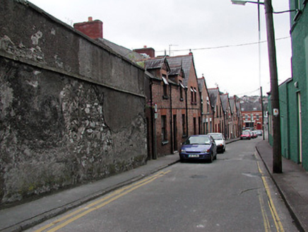 Terraced gable-fronted two-bay two-storey house, built c. 1900. Pitched slate roof with red brick chimneystack and terracotta finial. Red brick walls with limestone threshold to front door. Replacement windows and door.