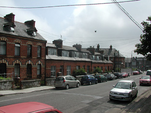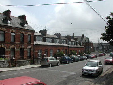 Terraced three-bay single-storey house with dormer attic, built c. 1878, as a group of four with the adjoining houses to the north-west and south-east. Pitched slate roof having red brick chimneystack and flat-roofed dormer. Red brick walls with yellow brick string course. Replacement windows and door. Retaining original toplight. Roughly dressed limestone boundary walls having red brick dressings, cast-iron railings and cast-iron gate.