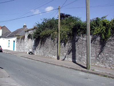 Round-headed dressed limestone gateway, built c. 1840, now blocked. Set in roughly dressed stone boundary wall.