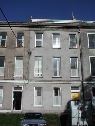 Terraced three-bay three-storey house with dormer extension, c. 1835, having rendered facade, eaves cornice and parapet and square-headed door opening with plain fanlight and simple timber pilaster doorcase; replacement timber sash windows; two-storey outbuildings to rear; part of composite terrace; double pitched slate roof and rendered walls with corbelled string course; area to front of terrace is enclosed by cast iron railings and the site is elevated.