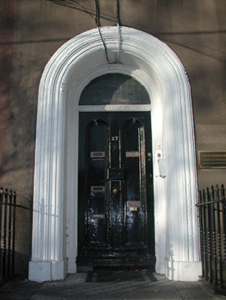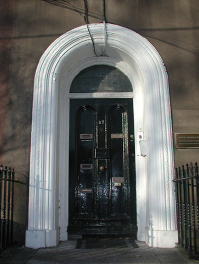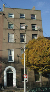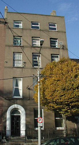 Semi-detached three-bay five-storey over basement house, c.1820, having graduated fenestration, timber panelled door with stained glass overlight and roll moulding to door surround with steps up; rendered walls with narrow string courses to upper storeys.