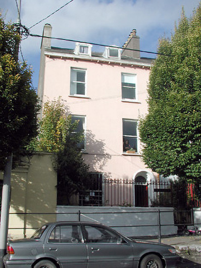 Terraced two-bay three-storey house with dormer attic, c. 1835, slate pitched roof, walls have painted render finish, retaining timber sash windows to all floors except dormer attic, round-headed door opening with moulded surround and leaded glass overlight, bracketed eaves and cast iron railings to small front garden.