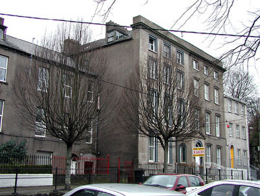 Terraced three-bay four-storey over basement house, c. 1825, with projecting porch with limestone steps up added, c. 1900; moulded surround to door, timber sash windows and cast iron railings to front; slate hipped roof and rendered walls; annexe to rear.