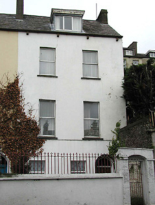 Semi-detached two-bay three-storey house, c. 1835, with round-headed door opening, gutter brackets and arched brick garden gateway; slate pitched roof with flat roofed dormer extension, c. 1900; rendered walls.