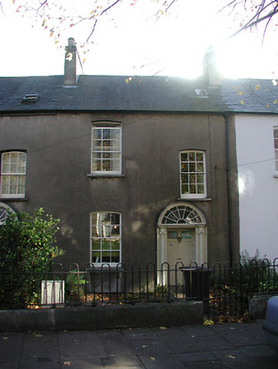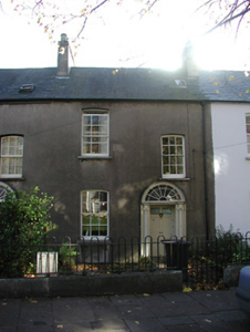 Terraced two-bay two-storey over basement house, c. 1825, with camber-headed window openings, round-headed door opening with Ionic doorcase. Slate pitched roof with dormer attic and small skylight to front. Rendered walls. Later front garden railings.