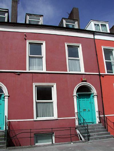Terraced two-bay two-storey over basement house, c. 1835, with round-headed door opening having timber architrave and single pane fanlight, moulded surrounds to openings and stringcourses, and limestone steps up to entrance. Asbestos tile roof with flat roofed dormers. Rendered walls. Windows replaced, but part of panelled door original.