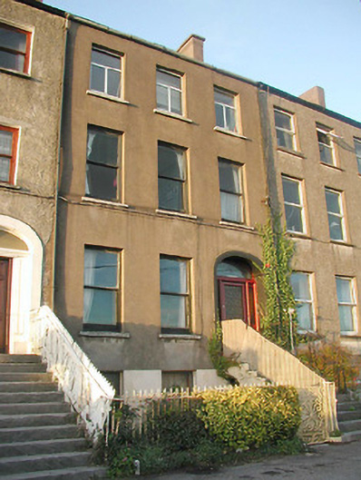 Terraced three-bay three-storey over raised basement house, c. 1830, having stone entrance steps, round-headed doorway and wrought iron railings; doorcase altered; timber sash windows retained, with the exception of the top floor. Asbestos tile pitched roof. Rendered walls.