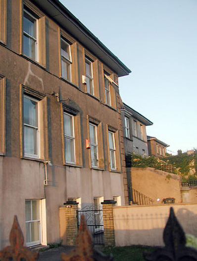 Built on a relatively grand scale, this house, which is one of a pair, has moulded window surrounds, steps up to the main entrance and a garden to the front. It is situated on an elevated and prominent position above Kent Station.