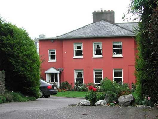 Detached five-bay two-storey house, c. 1830, with two-storey flat-roofed extension to east side and vehicle and pedestrian gateways from street. Slate hipped roof and painted rendered walls.