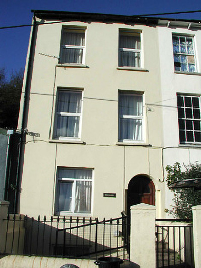 End-of-terrace two-bay three-storey over basement house, c. 1845, having round headed doorway and cast iron railings to front garden. Slate pitched roof with rooflight and carved eaves brackets. Painted rendered walls.