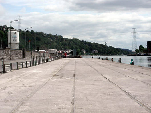 Limestone quay running along north bank of river Lee, c. 1860, having set of limestone steps. With later concrete wharf extension.