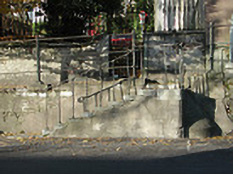 Raised pavement with rubble sandstone retaining wall, c. 1835, having cast iron railings. Cut limestone steps from road to pavement, some having cast iron railings and handrail.