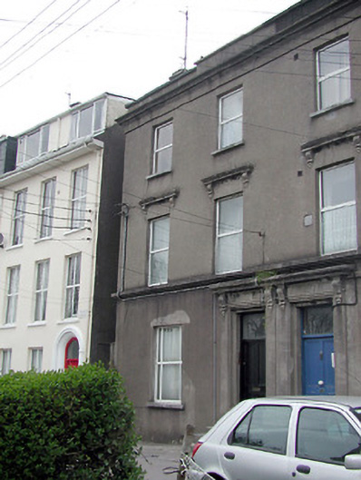 End of terrace two-bay three-storey house, c. 1845, having bracketed hoods to pilaster doorcase and first floor windows, parapet, slate roof and rendered façade. Limestone steps up to front door which has a large square overlight. Three-storey return to rear.