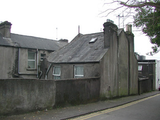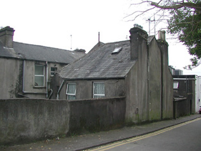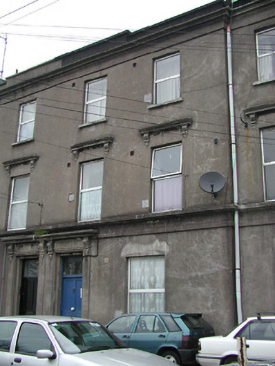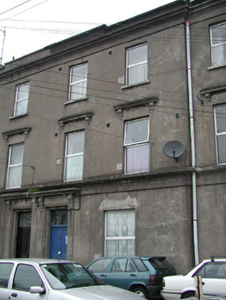 Terraced two-bay three-storey house, c. 1845, having bracketed hoods to pilaster doorcase and first floor windows, parapet, asbestos roof and rendered façade. Limestone steps up to front door which has a large square overlight. Three-storey return to rear.
