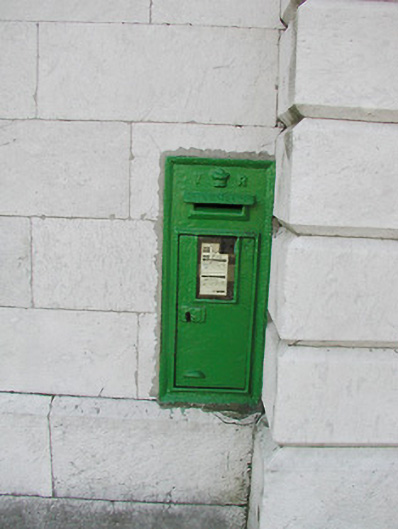 Cast-iron wall-mounted letterbox, c. 1890, with raised 'VR' insignia; set in wall of former CIE area offices.