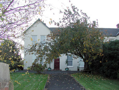 Semi-detached five-bay two-storey house, built 1890, with two-storey gabled projection incorporating single-storey bay and with balcony area over three-bay single-storey flat-roofed entrance projection; set back behind railings.