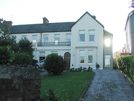 Semi-detached five-bay two-storey house, built 1890, with two-storey gabled projection incorporating single-storey bay and with balcony area over three-bay single-storey flat-roofed entrance projection; set back behind railings; later addition to side.