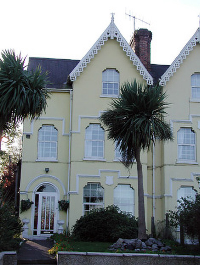 Semi-detached three-bay three-storey house, built 1892, with two-bay three-storey gabled projection to front elevations and round-headed entrance; set back behind railings.