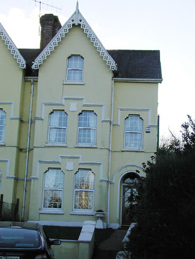 Semi-detached three-bay three-storey house, built 1892, with two-bay three-storey gabled projection to front elevations and round-headed entrance; set back behind railings.