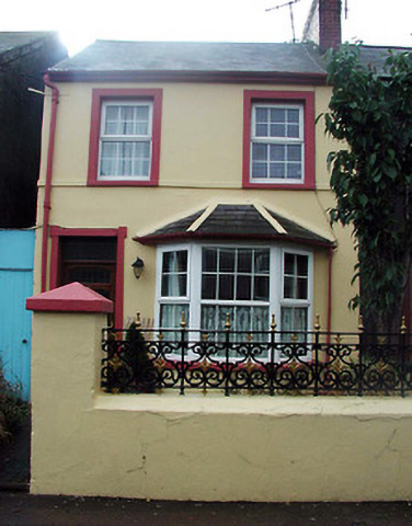 Terraced two-bay two-storey house, built 1908, with bay window to ground floor. Tiled double pitched roof with rendered chimney stack, hipped slate roof to bay. Painted render finish with plat band to first floor sill level and plain architraves to first floor windows and entrance door. Square headed openings, windows having sills and being replacement uPVC. Glazed timber entrance door. Decorative cast-iron railings to front, with garden areas to front and rear; one of four.